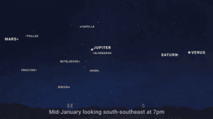 January 25: A Great Planet Alignment? You may see a lot of media hype about a “great planet alignment” on January 25. It’s not unusual to see planets in a long line in the sky and note Uranus and Neptune are not even visible with the naked eye or binoculars. However, what is special is to see four bright planets at the same time! It will be an amazing planet display you don’t want to miss. Look to the southwest for super-bright Venus and Saturn. Then, look southwest for Jupiter high in the sky.