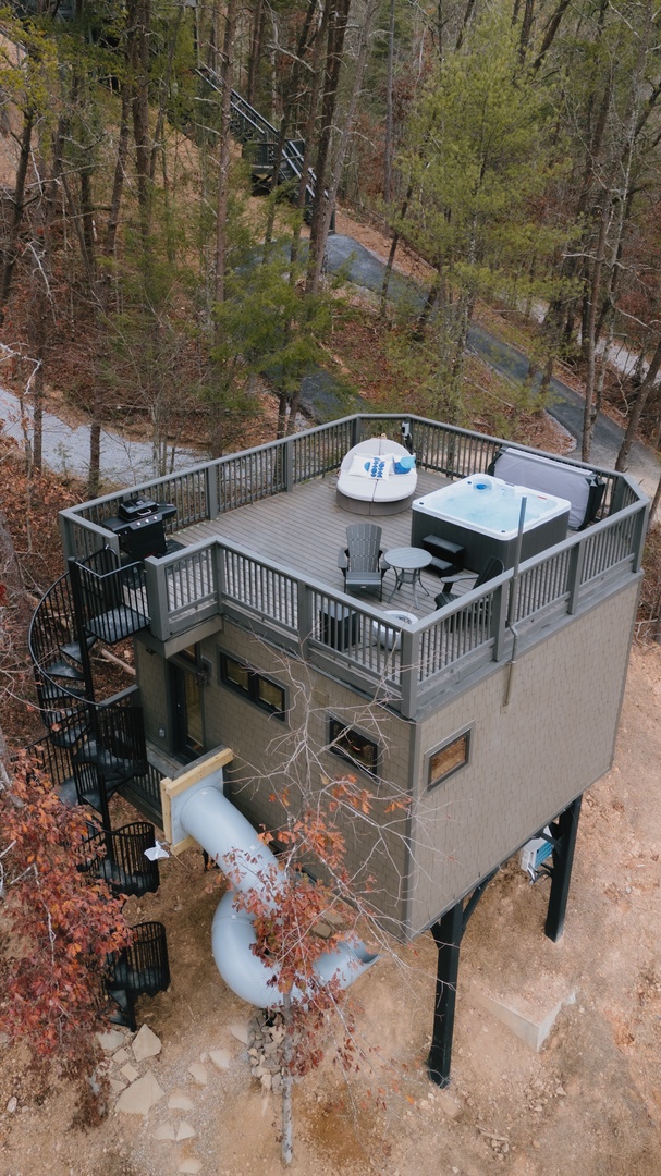 This studio-style treehouse is designed for romance and relaxation. The rooftop deck features a private hot tub, propane fire pit, stargazing bed, and propane BBQ—perfect for watching sunsets and cozy nights together. Inside, you’ll find warm, modern finishes and panoramic views. Outside, a built-in slide adds a playful twist. With total privacy and unobstructed views, Rigel offers a one-of-a-kind couples’ getaway.