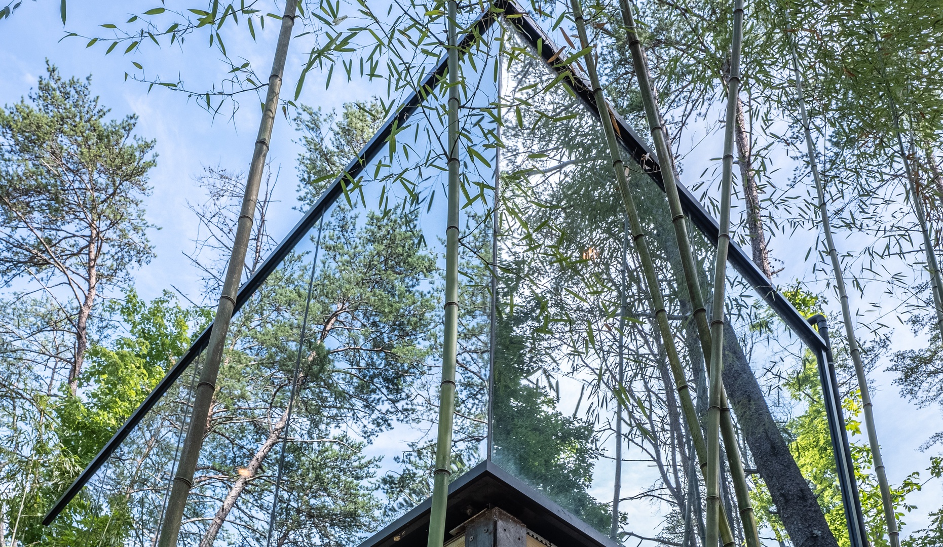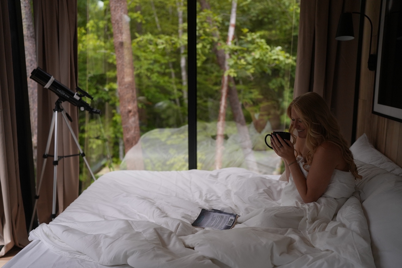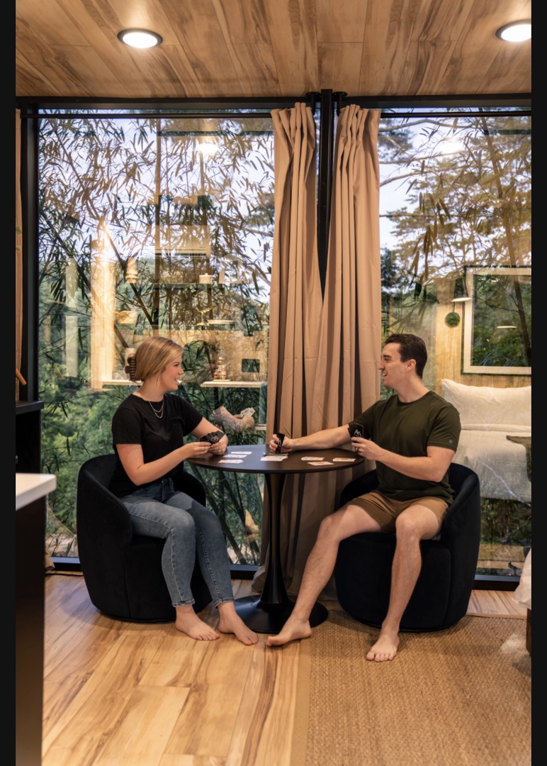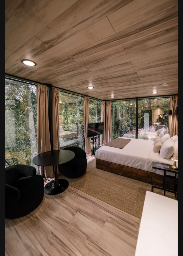 Step into a private studio mirror house designed with reflective glass that blends seamlessly with the surroundings, ensuring complete privacy. Inside, enjoy a king bed with luxury linens, a fully equipped studio kitchen, and a private sauna for the ultimate in relaxation. Outside, the intimate outdoor living space invites you to unwind together with a stargazing bed, cozy seating, a wood-burning fire pit, and a secluded hot tub perfectly positioned beneath the stars for memorable romantic evenings.
