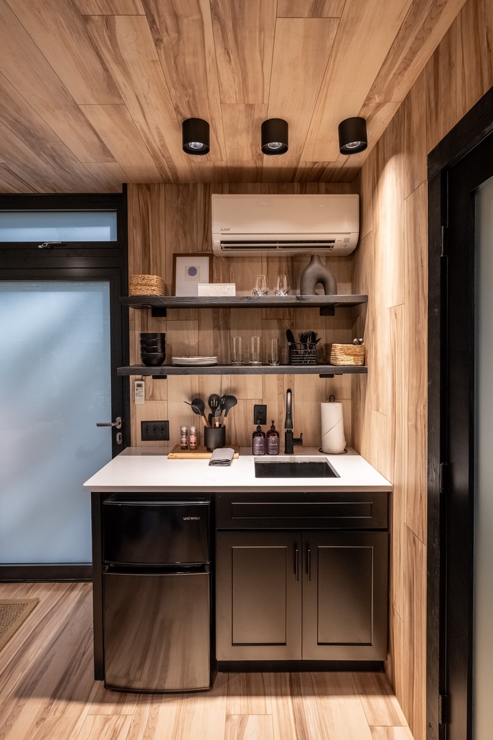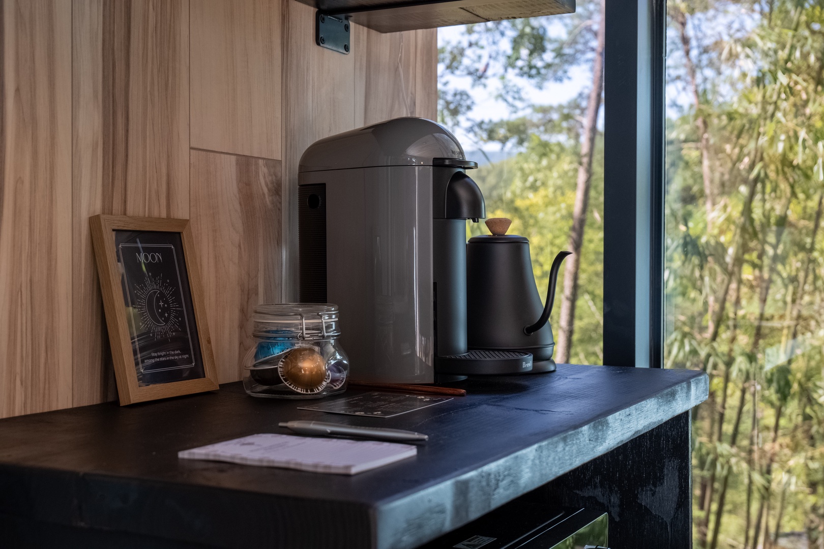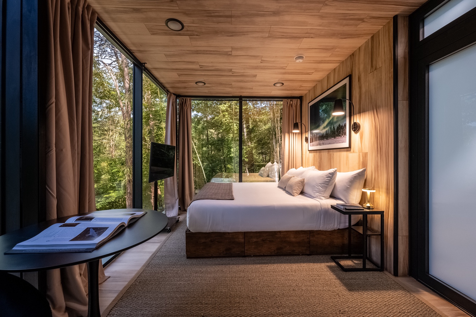 Step into a private studio mirror house designed with reflective glass that blends seamlessly with the surroundings, ensuring complete privacy. Inside, enjoy a king bed with luxury linens, a fully equipped studio kitchen, and a private sauna for the ultimate in relaxation. Outside, the intimate outdoor living space invites you to unwind together with a stargazing bed, cozy seating, a wood-burning fire pit, and a secluded hot tub perfectly positioned beneath the stars for memorable romantic evenings.