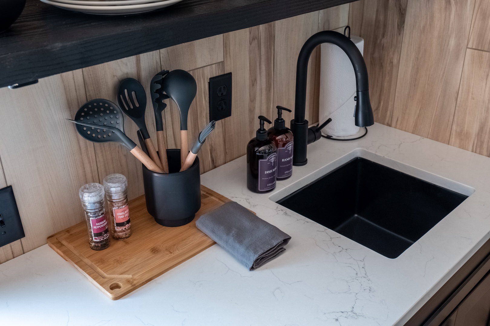 - Studio kitchen, steeped coffee, mini refrigerator with freezer, compact two burner induction stove top, and multi function toaster oven.